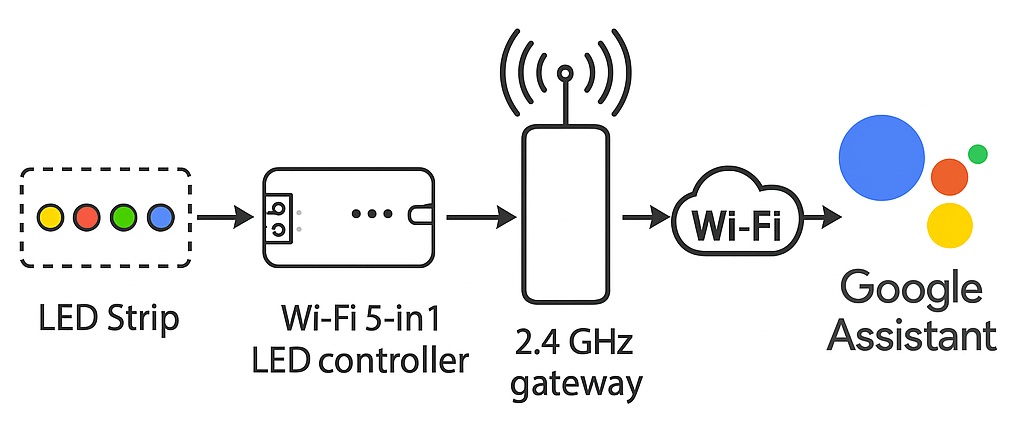 Moduli (2,4 GHz gateway in 5-v-1 LED strip controller) so namenjeni pametnemu upravljanju LED trakov preko WiFi / radijskega signala (2,4 GHz). Če proizvajalec ponuja aplikacijo (ali podporo za Tuya, Smart Life ipd.), je tudi integracija z Google Assistant možna.
