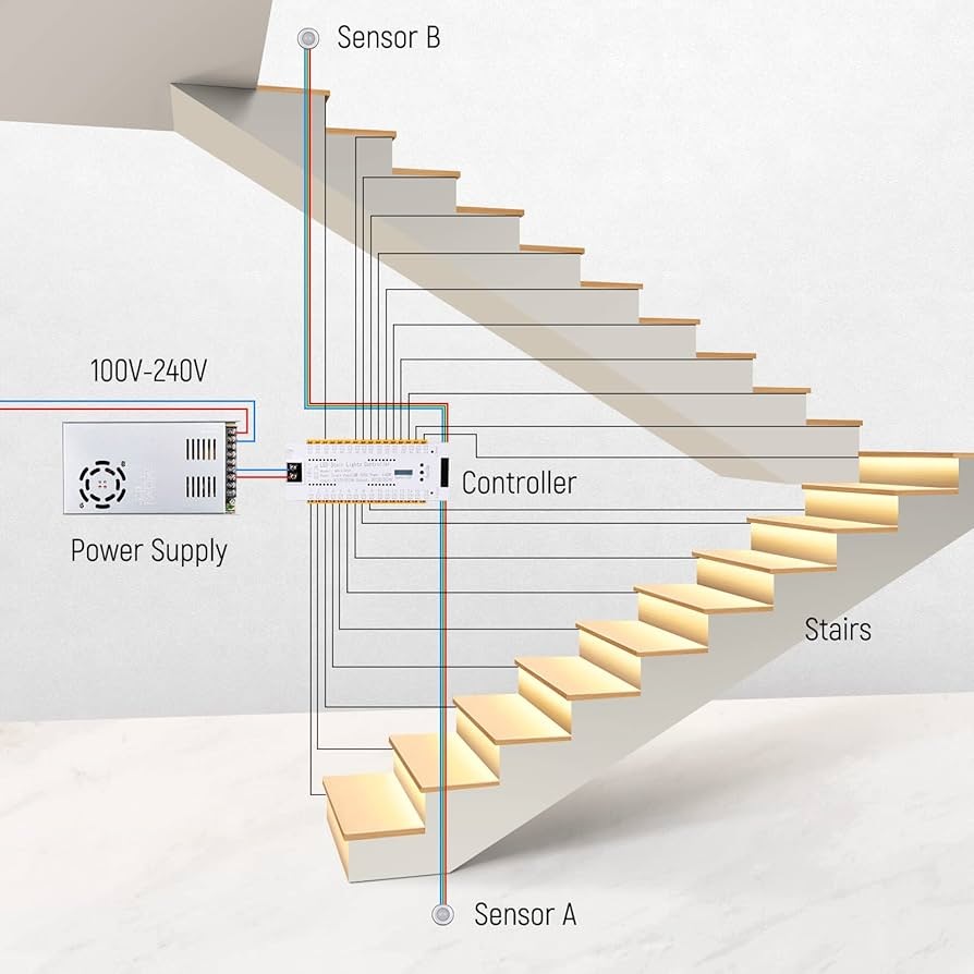 Z LED stopniščnim krmilnikom lahko ustvarite osvetlitev stopnic, ki se prižge postopoma, pri čemer se svetloba "preliva" od ene stopnice do druge, kar ustvari prelepo, kaskadno učinkovitost.