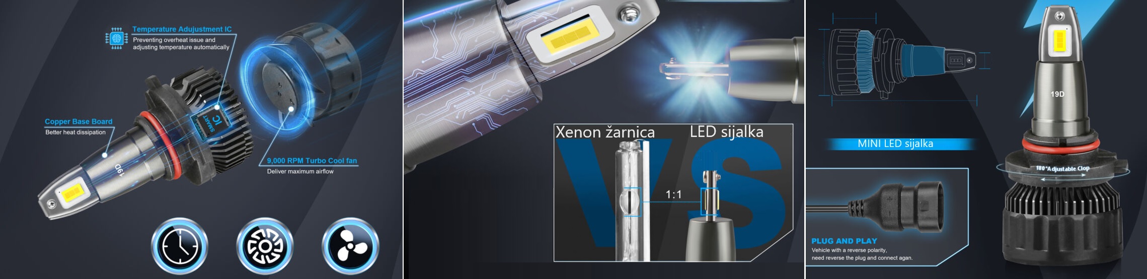 Visoka temperatura: Klasične in ksenonske žarnice oddajajo veliko več toplote kot LED sijalke. Ta visoka temperatura lahko negativno vpliva na LED sijalke.