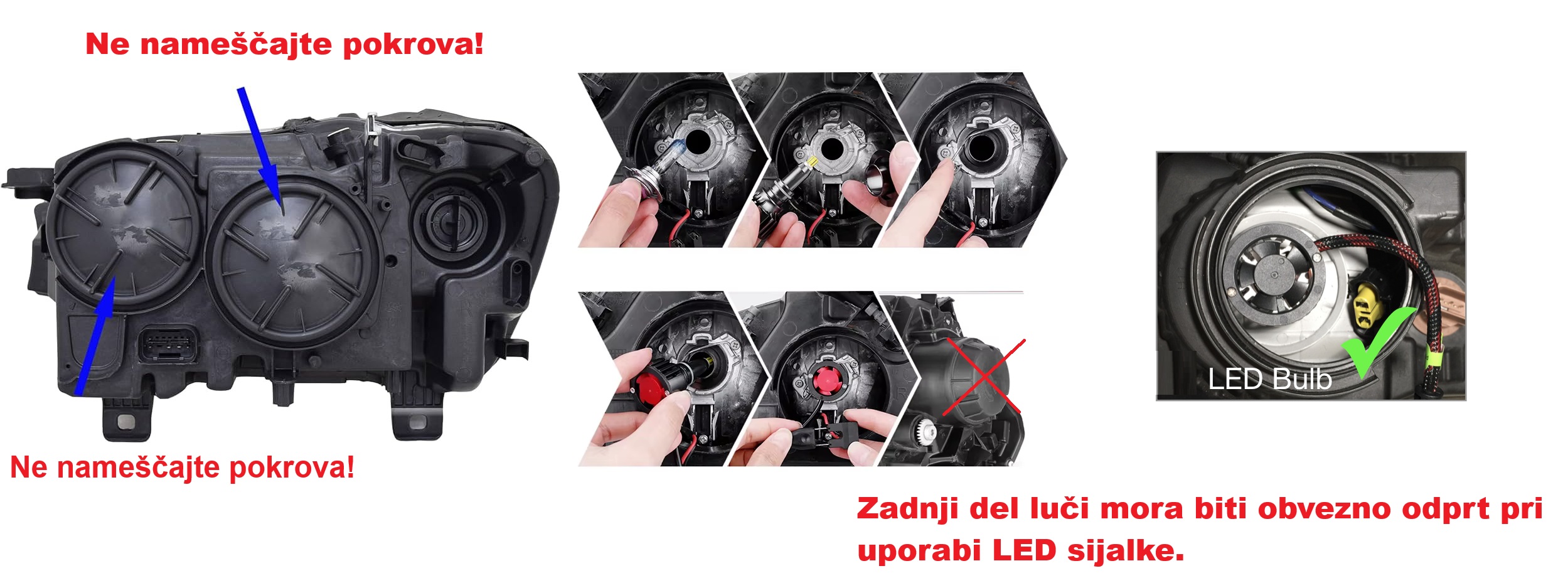 Uporaba pokrova za LED sijalke ni priporočljiva in zato odsvetujemo uporabo pokrova (ali pa uporabljate še naprej originalno žarnico).