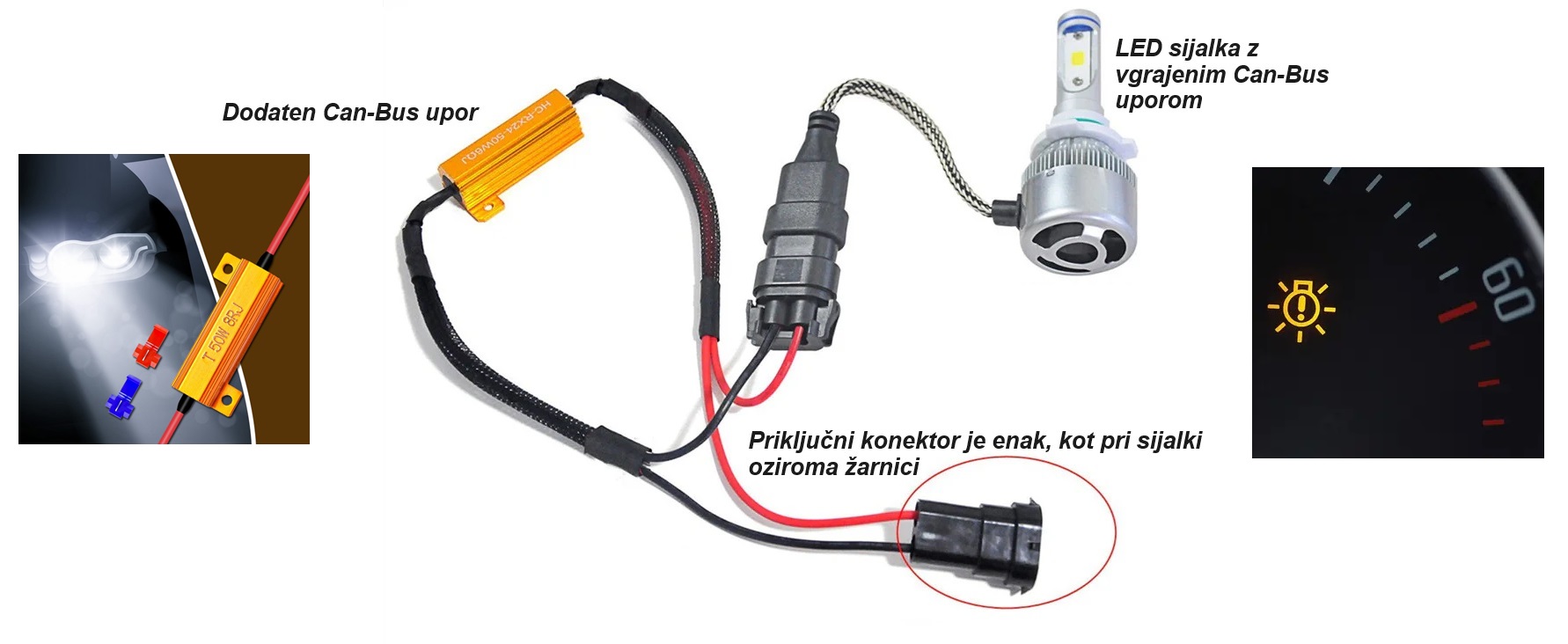 Primer dodatnega Can-Bus upora: Če uporabljate LED sijalke z močjo 21W, namestite dodaten Can-Bus upor, ki ustreza tej moči, običajno med 25W in 50W.