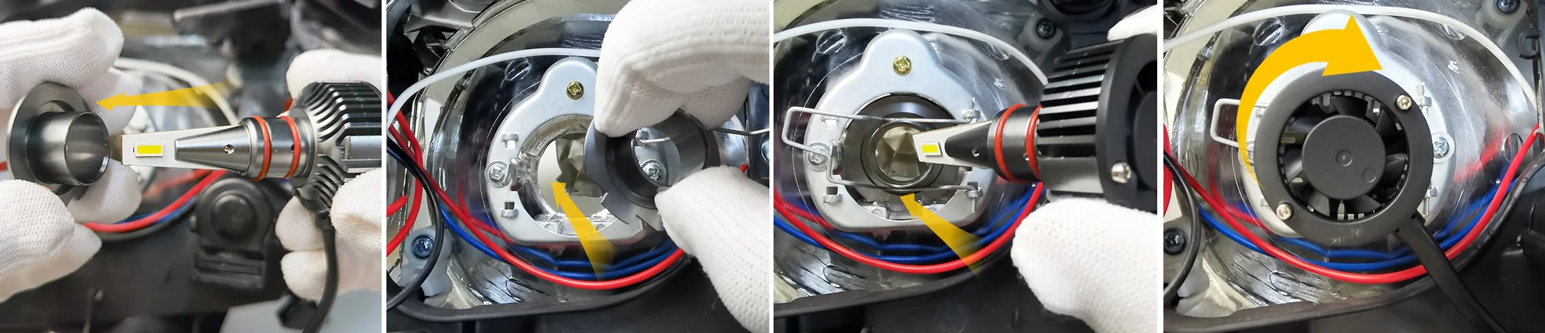 1.Snamite obroč, ki je na LED žarnici (glej prvo sliko z leve). POZOR! Vsem LED sijalkam ni moč ročno sneti obroča, na primer pri modelu H1, H3, oz pri modelih, zato so ti obroči na teh žarnicah privijačeni in jih za montažo ni potrebno sneti.